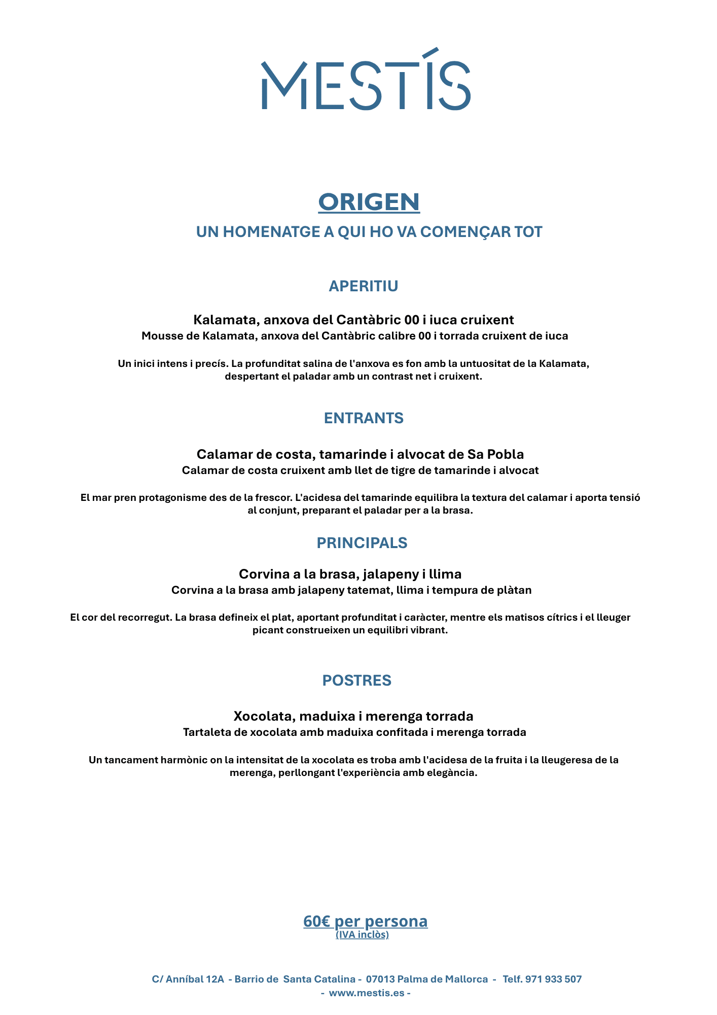 Per a aquest Dia de la Mare, a Mestís hem creat un menú especial pensat per compartir, que recorre la nostra essència Bajamed a través d’una selecció de plats concebuts per emocionar i gaudir. Amb producte local de Mallorca, tècnica acurada i aquest mestissatge que defineix la nostra cuina Bajamed.